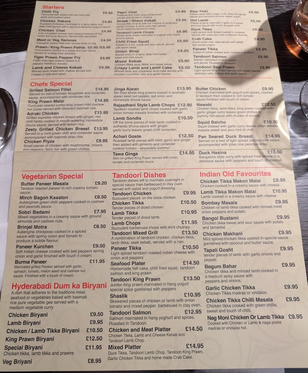 The Hyderabadi Dum Ka Biryani offers a flavorful Chicken Biryani, alongside other biryani variations like the Lamb Biryani, Chicken or Lamb Tikka Biryani, and indulgent King Prawn Biryani. If you're looking for something more special, the Special Biryani is the ultimate indulgence.