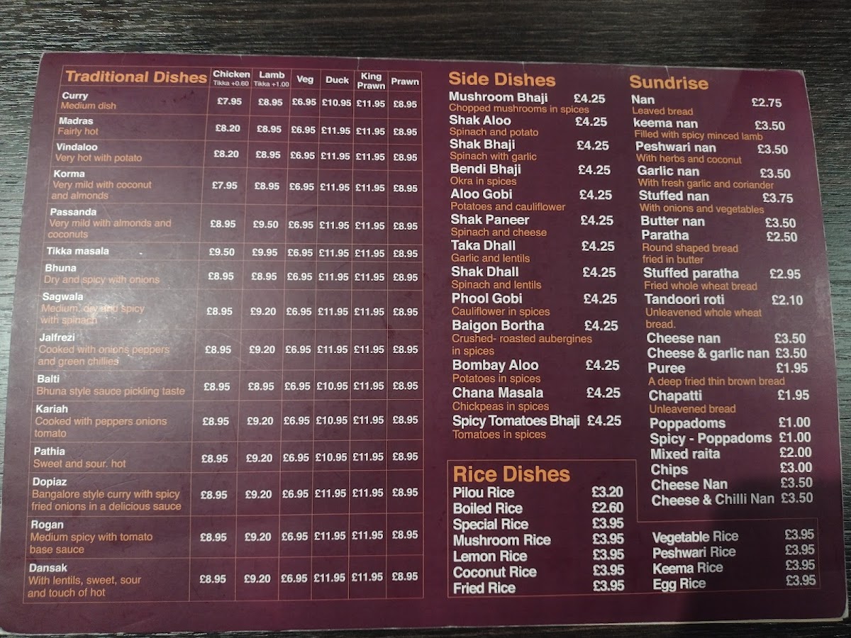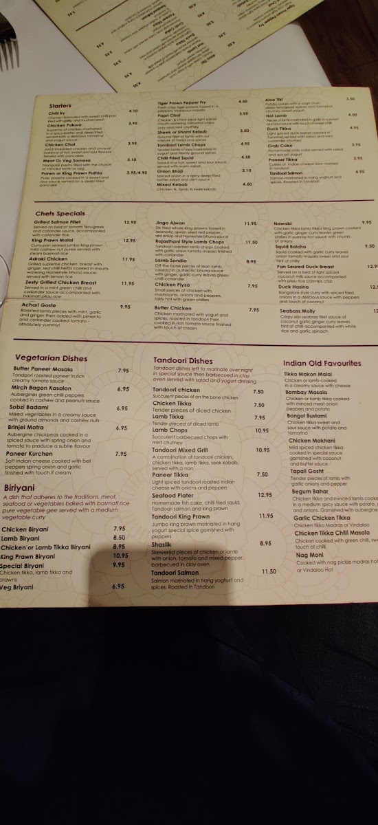 Traditional curry lovers will find their favorites in the Curry, Madras, Vindaloo, Korma, and Passanda. These dishes deliver a range of flavors, from mild and creamy to fiery hot, catering to all preferences.